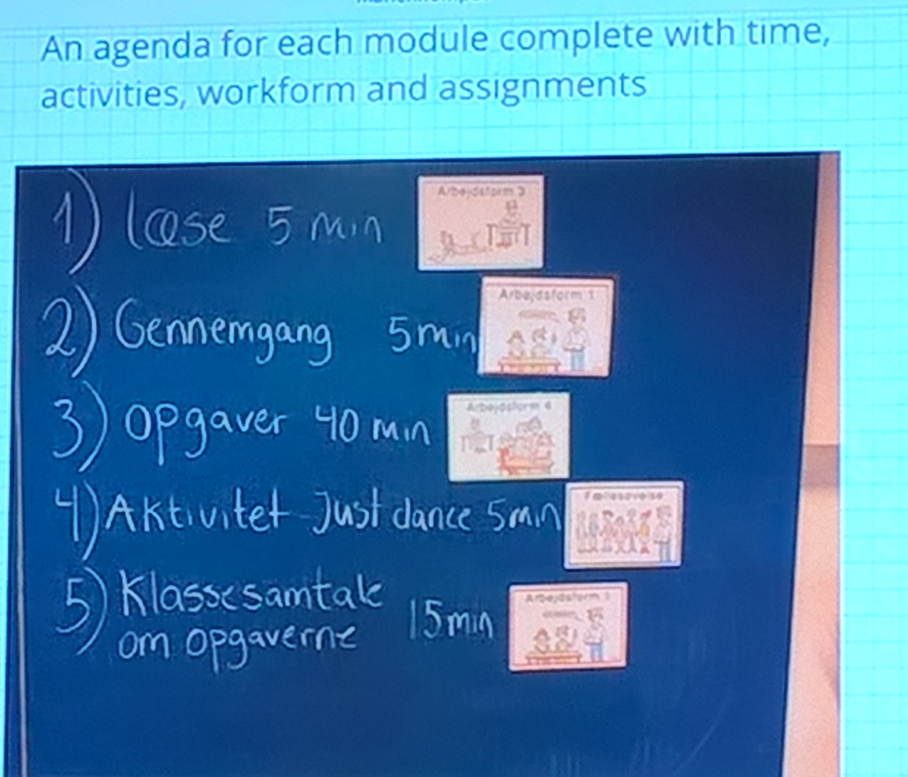 - Iată cum arată un modul / o activitate de învățare ( = un plan de lecție afișat), cu activități, timpul alocat și materiale de învățare:
